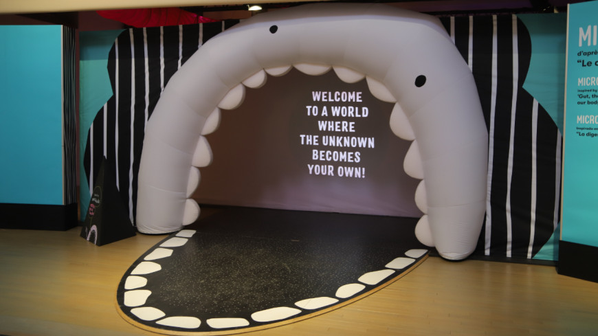 Afin de se positionner au mieux comme observateur du tube digestif, c’est par une bouche géante que l’on accède à l’exposition. “C’est quasiment un safari, on entre dans le corps et on se rend compte qu’il y a pleins de microbiotes que l’on ne connaît pas“, explique Jérémy Camus, le vice-président de la Métropole. Des dispositifs interactifs, audiovisuels, tactiles et des maquettes sont à disposition, une dissection en 3D est également réalisable. Un intestin immense est suspendu dans les espaces entourant le Dôme des Quatre Rangs.