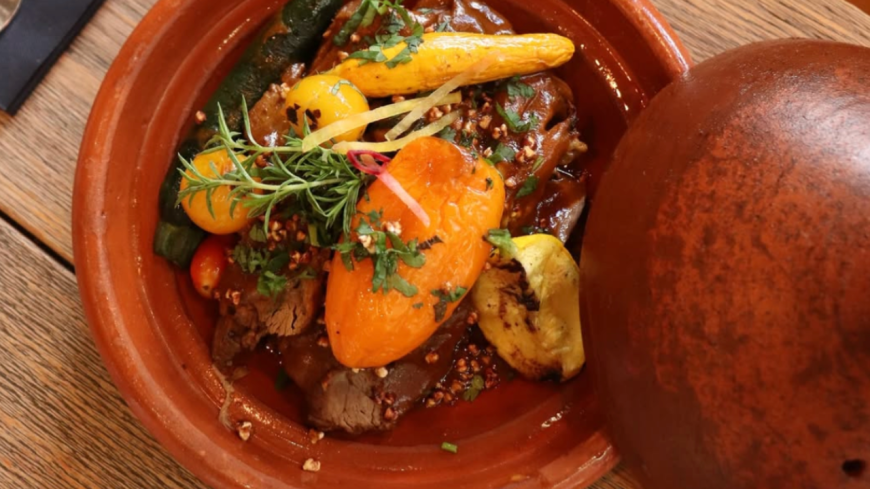 Côté terre, on se laisse tenter par un tajine de poulet à la Chermoula, qui arrivera avec du retard, au moment du dessert des autres convives, en raison d’une légère surcharge au niveau du service. Mais l’attente en valait la peine, le poulet est parfaitement cuit, les abricots sont moelleux et la semoule verte aux herbes fond en bouche.